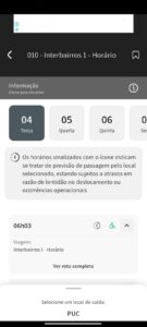 Caso o horário indicado seja uma previsão de passagem por determinado ponto do itinerário, um ícone e um aviso indicam esta situação, e algumas linhas poderão ter informações adicionais – barra em cinza ou em amarelo caso haja um alerta vinculado à linha.