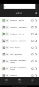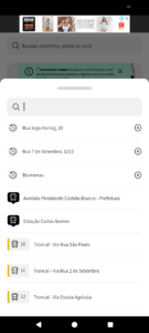 Ao selecionar, você verá uma relação das linhas de transporte público que operam em sua cidade. Os modais são diferenciados pelo ícone – pode ser ônibus, trem, metrô, VLT, barca, monotrilho, tróleibus. As cores e o código ao lado dos ícones refletem a identificação da linha no seu sistema de transporte.