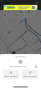 Você também pode navegar livremente pelo mapa e, ao pressionar por 2 segundos em qualquer local, o aplicativo permite selecionar o local como origem ou destino para planejar sua rota.