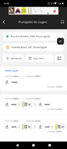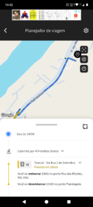 Selecionado o roteiro, o app apresenta o detalhamento do percurso. No mapa, os locais de onde você partirá e onde você quer ir, os pontos de conexão entre diferentes linhas oferecidas, e abaixo, um descritivo com cada etapa da viagem, informando que horas você deve chegar ao ponto, que horas seu transporte chegará, e até mesmo em qual veículo embarcar, caso informações em tempo real estejam disponíveis na sua cidade.