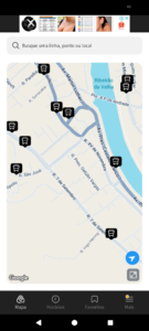 Ainda no mapa, é possível utilizar as funções “centralizar na minha localização” para visualizar pontos próximos de você e “expandir o mapa” para visualização de linhas ou planejar sua viagem pressionando pontos de interesse no mapa.
